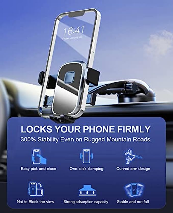 • 【SAFE AND STABLE】The car cell phone holder is made from new upgraded suction cups, which provide stronger grip. So it will stay in place better and is friendly to your phone on bumpy roads during emergency braking and sharp turns. The inner clip of the upgraded phone car mount adds air capsule silicone, which increases the friction by 60%.