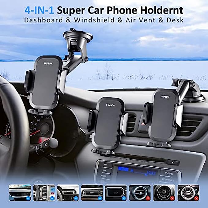 SUUSON Phone Holder for car -3in1 Long arm car Phone Holder Mount, Suitable for car Dashboard/Windshield/Vent, car Adjustable Phone Holder, Compatible with All Smart Phones and Cars