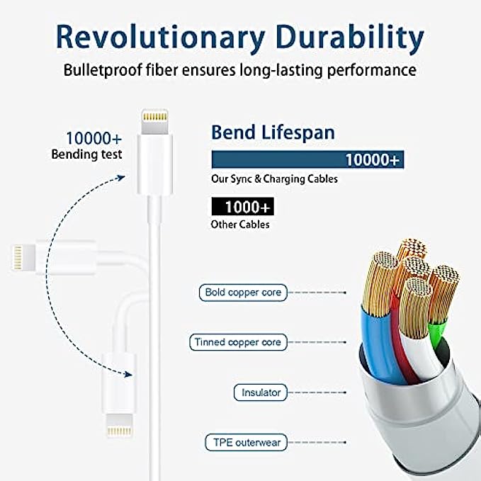 • 【Safety Efficient Fast Charging】 These apple chargers for iPhone owns bulit-in multi-protection system, avoiding from over-voltage, over-charge, over-heat, etc. The smart chip including in the MFi certified lightning cable matches the current required by the Apple device automatically, charges your iPhone/iPad device fast, safely and steadily. Tangle-free 6 Feet length is convenient for usage while charging and sync at home/office/travel in bed, hotel rooms, and more.